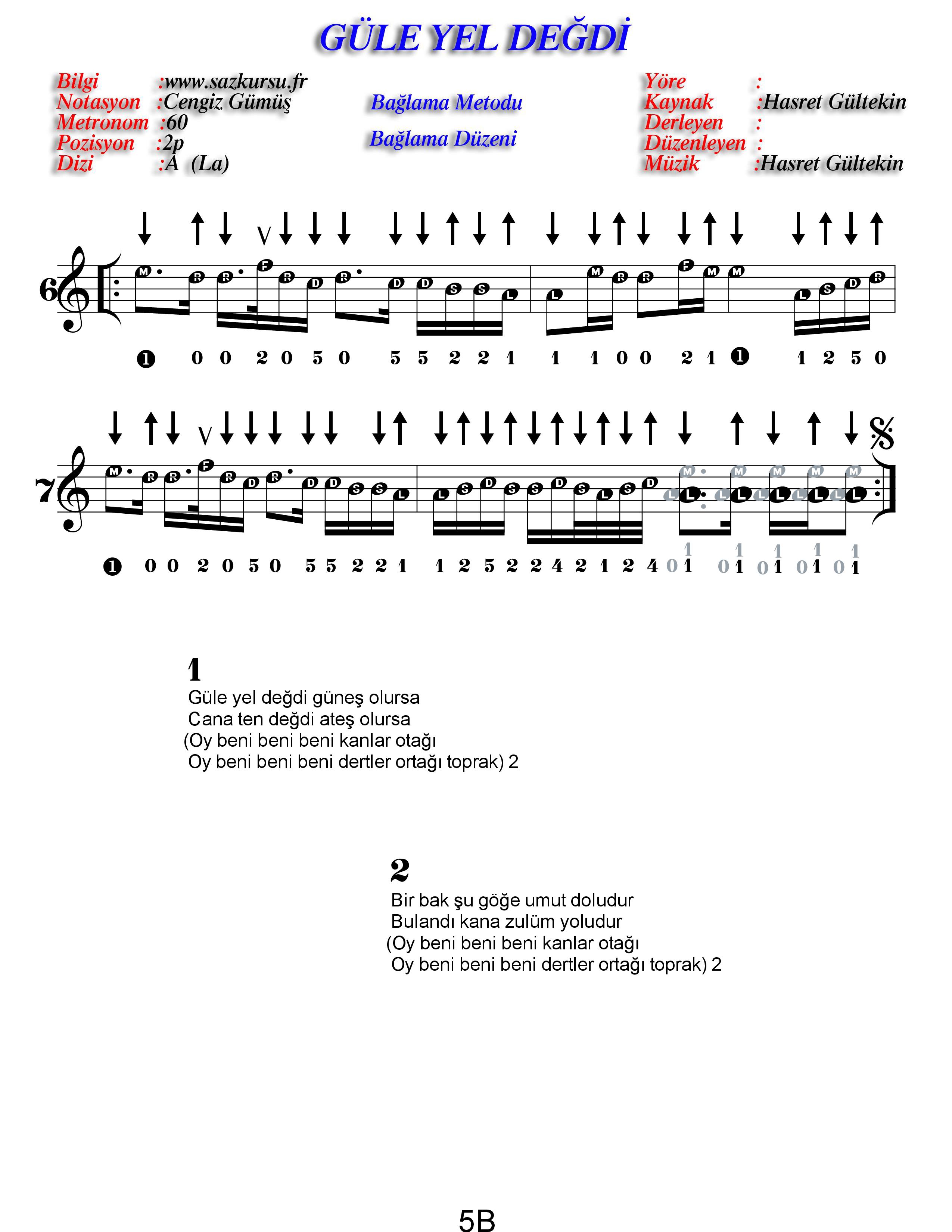 Güle Yel Değdi İleri Düzey Renksiz Özel Türkü Notaları