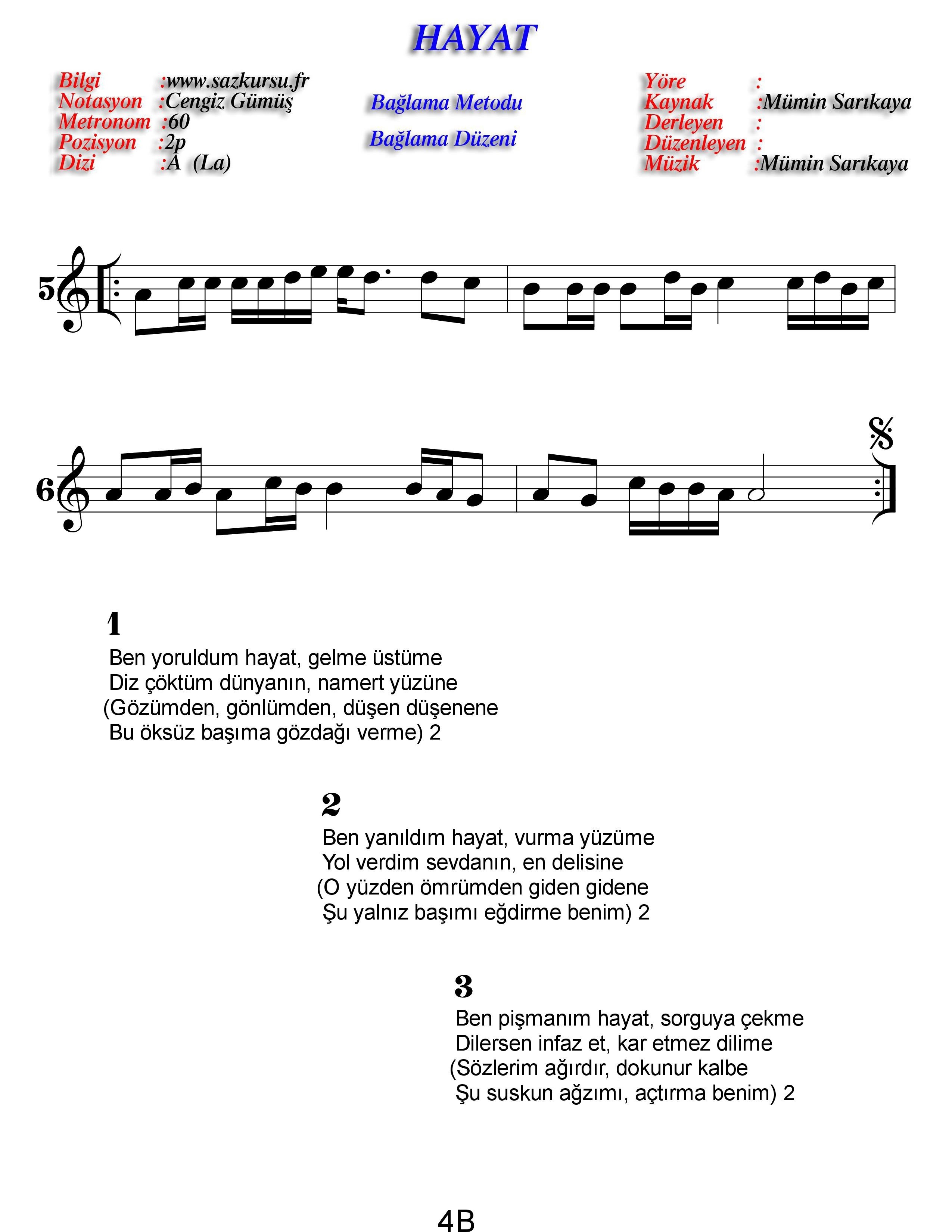 Hayat Başlangıç Düzeyi Sade Türkü Notaları