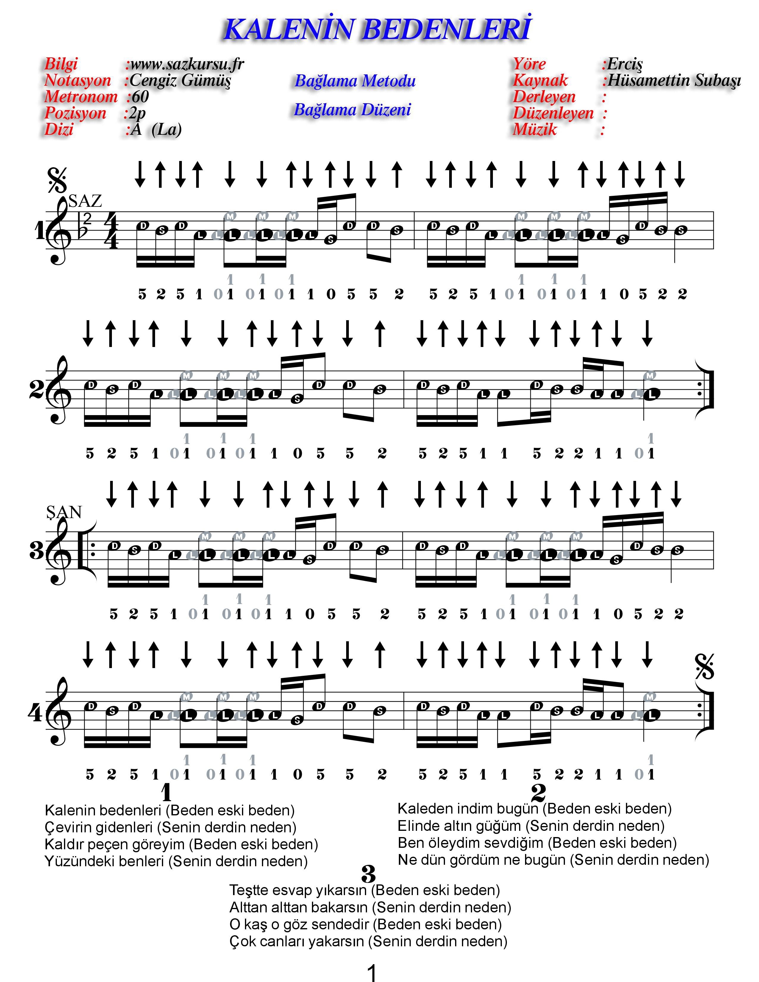 Kalenin Bedenleri Orta Düzey Renksiz Özel Türkü Notaları