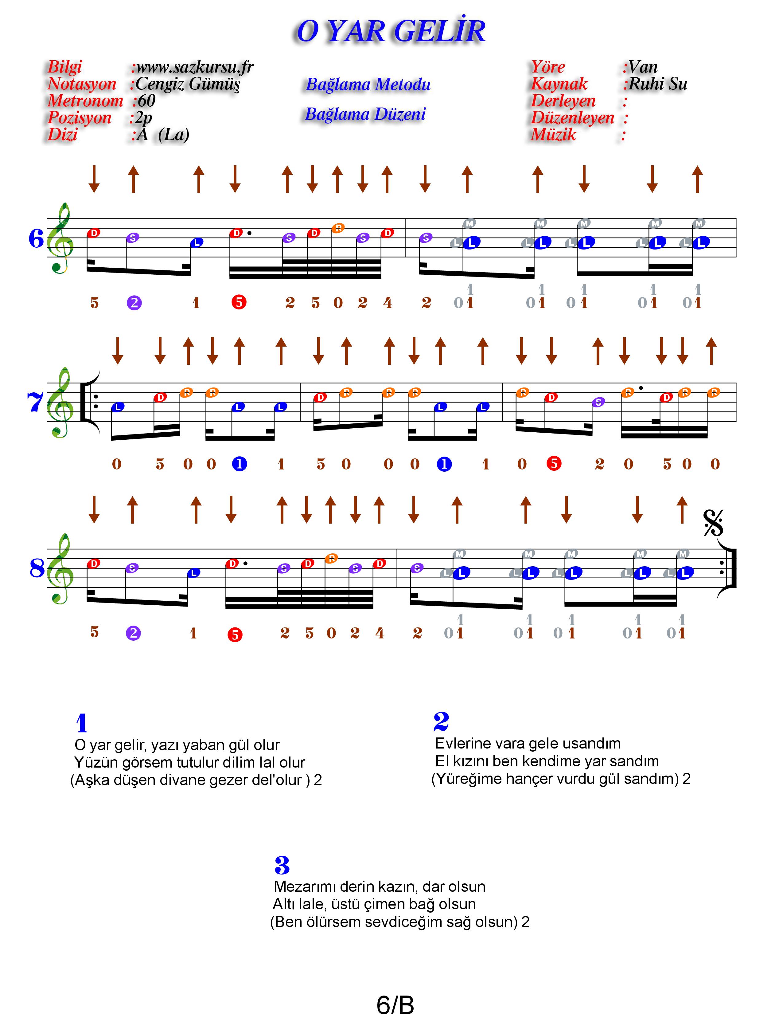 O Yar Gelir İleri Düzey Renkli Özel Türkü Notaları
