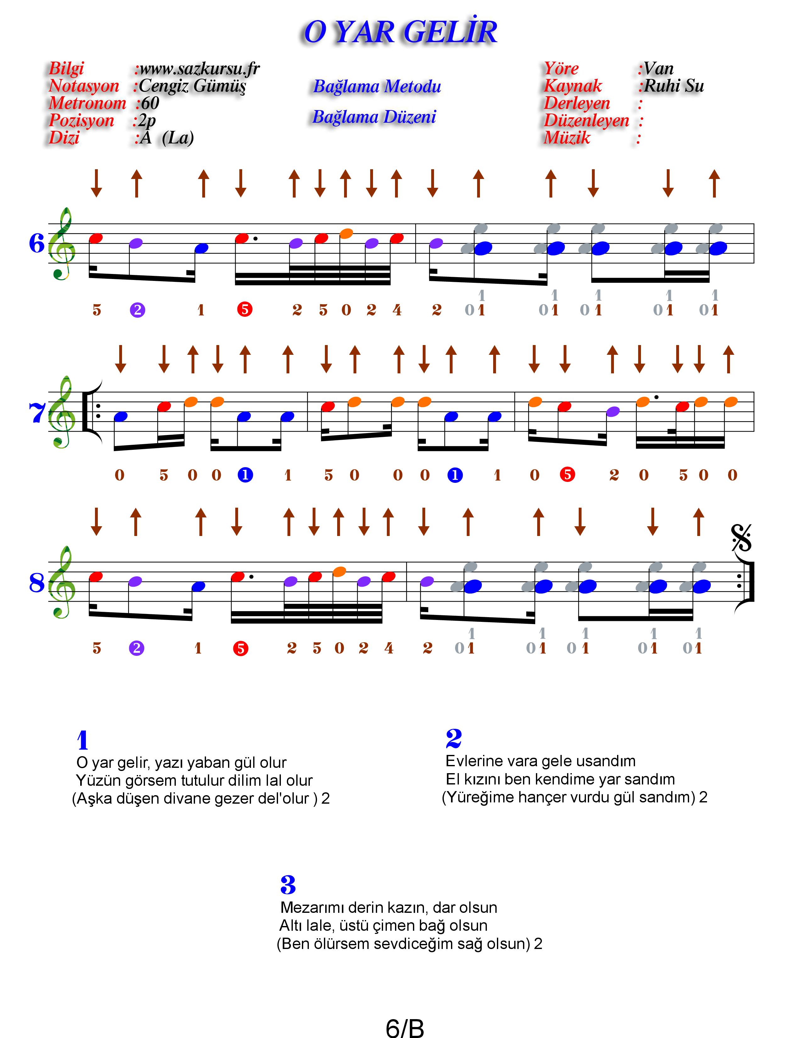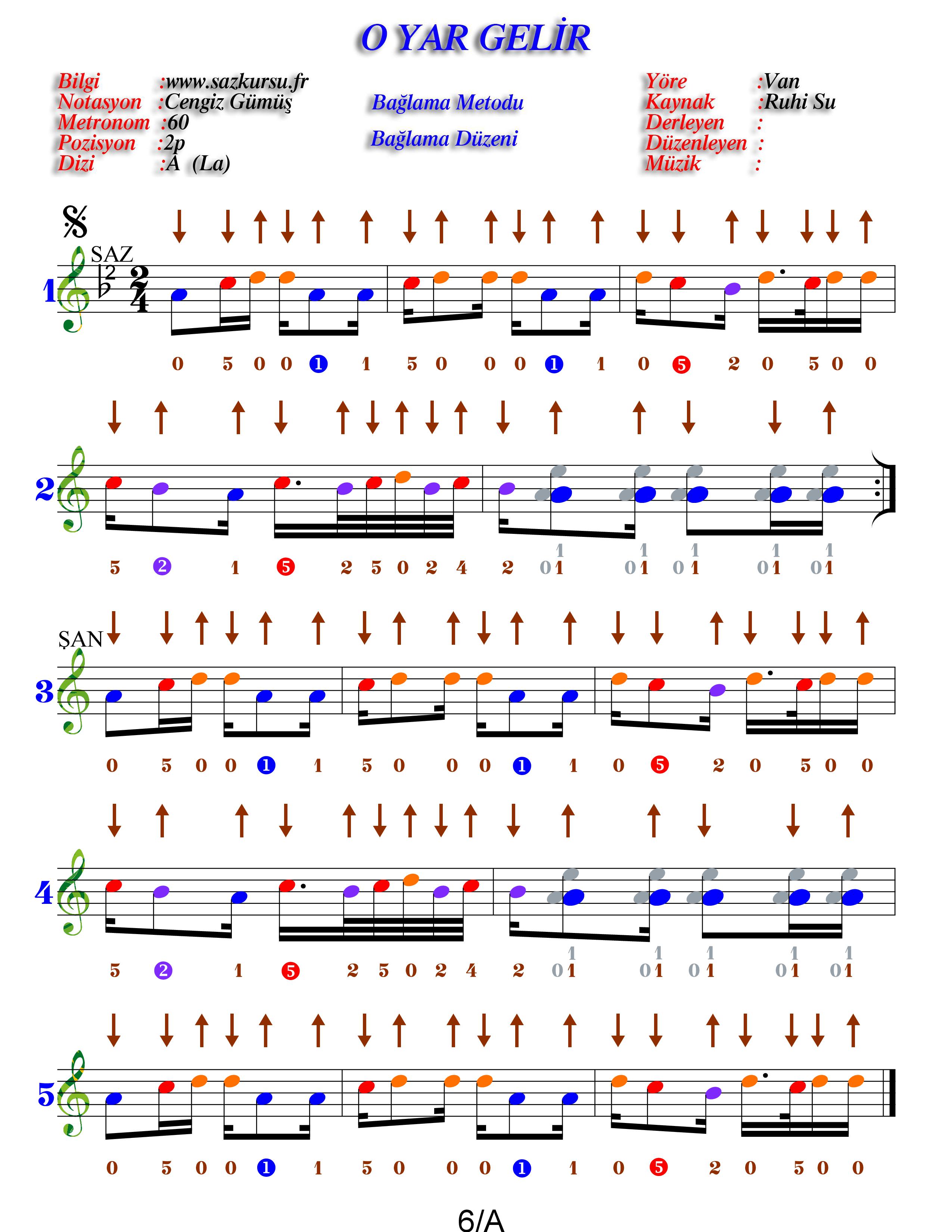 O Yar Gelir Orta Düzey Renkli Türkü Notaları