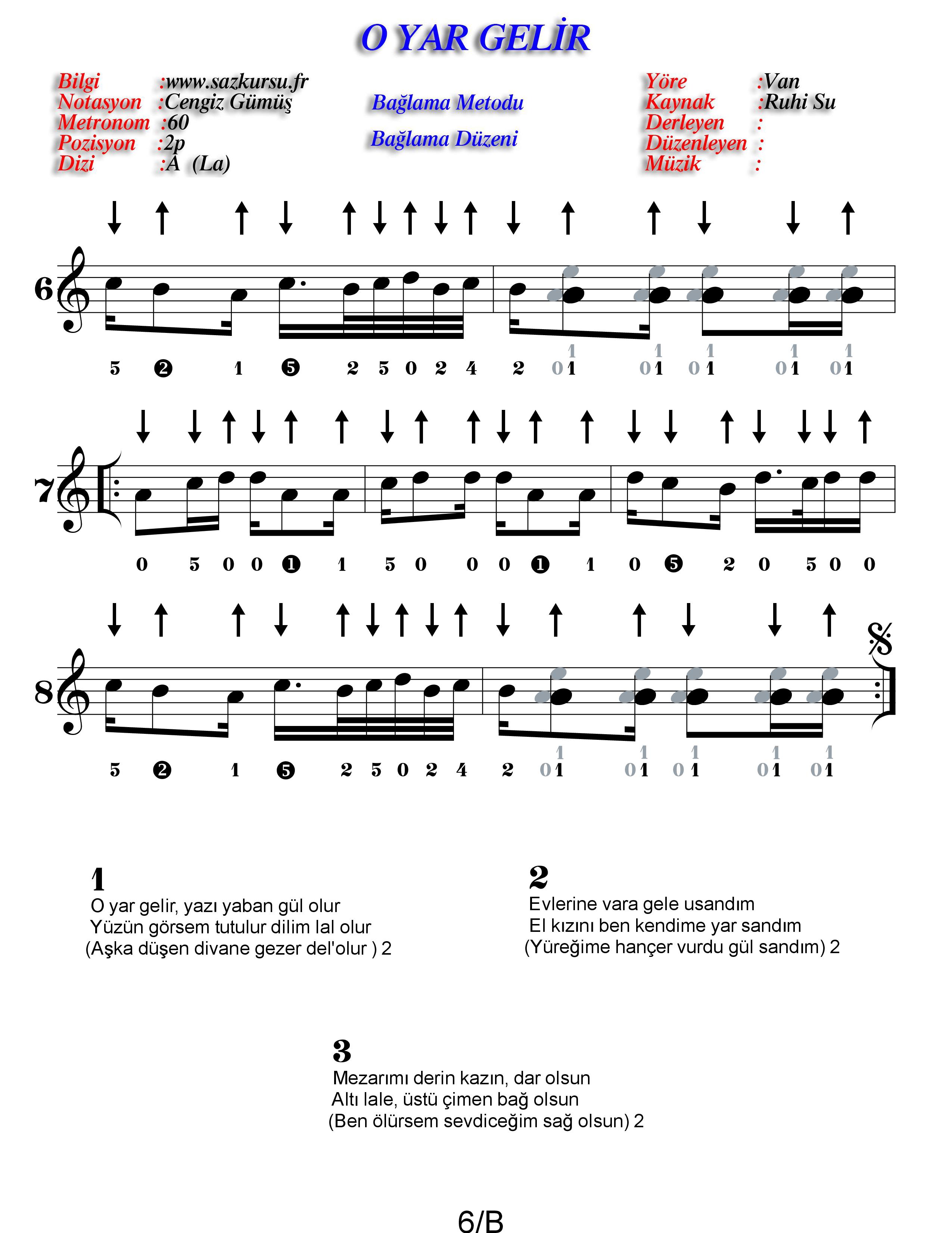 O Yar Gelir Orta Düzey Renksiz Türkü Notaları
