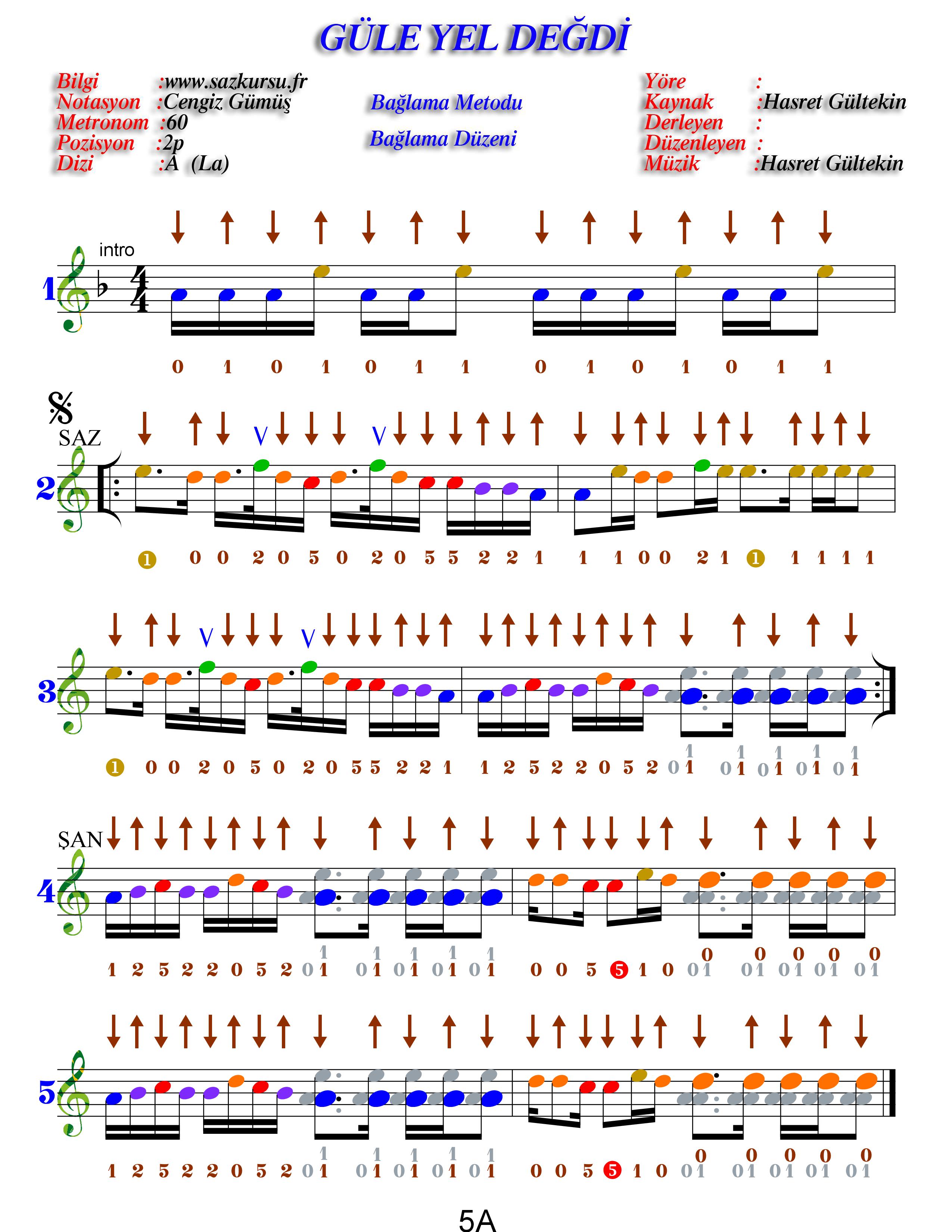 Güle Yel Değdi Orta Düzey Renkli Türkü Notaları