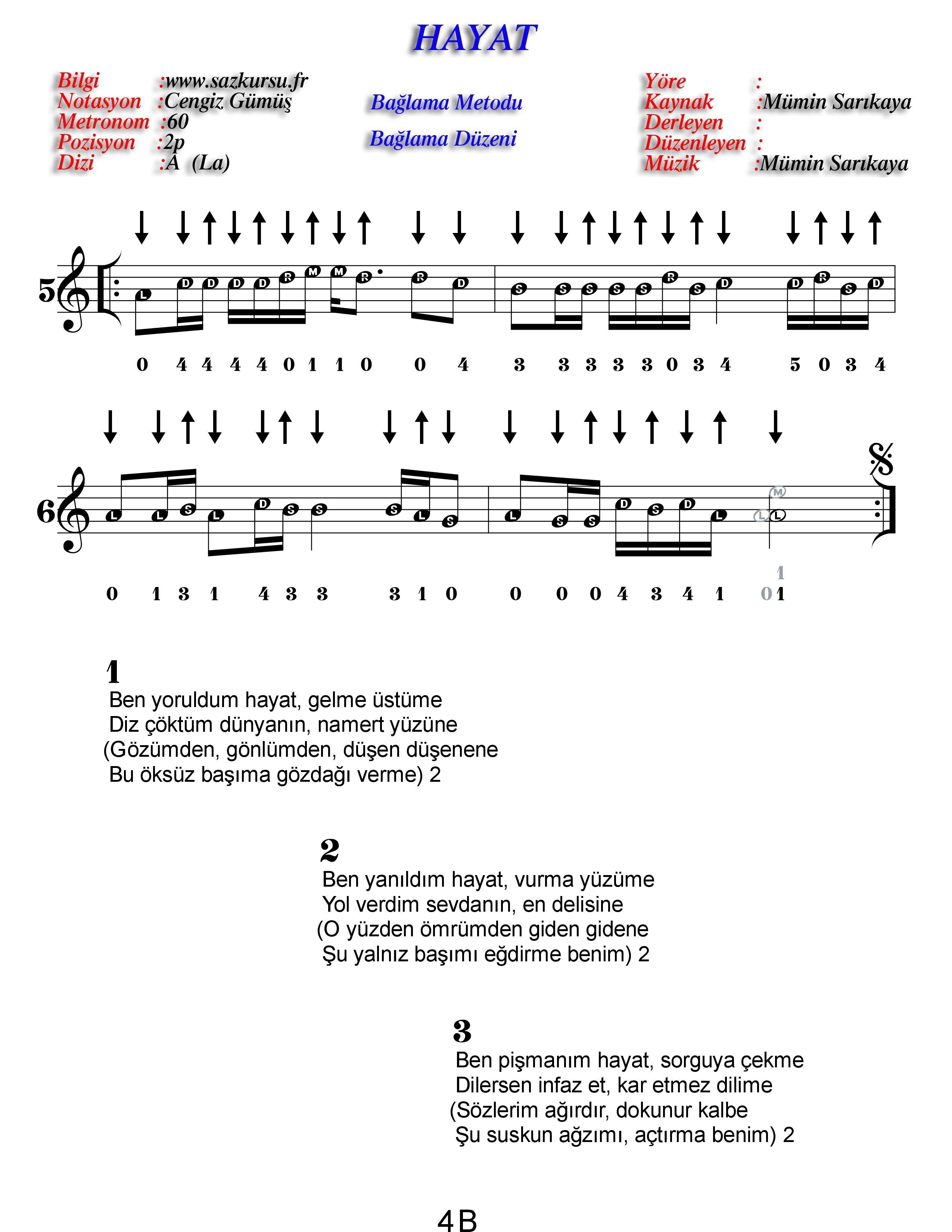 Hayat Başlangıç Düzeyi Renksiz Özel Türkü Notaları