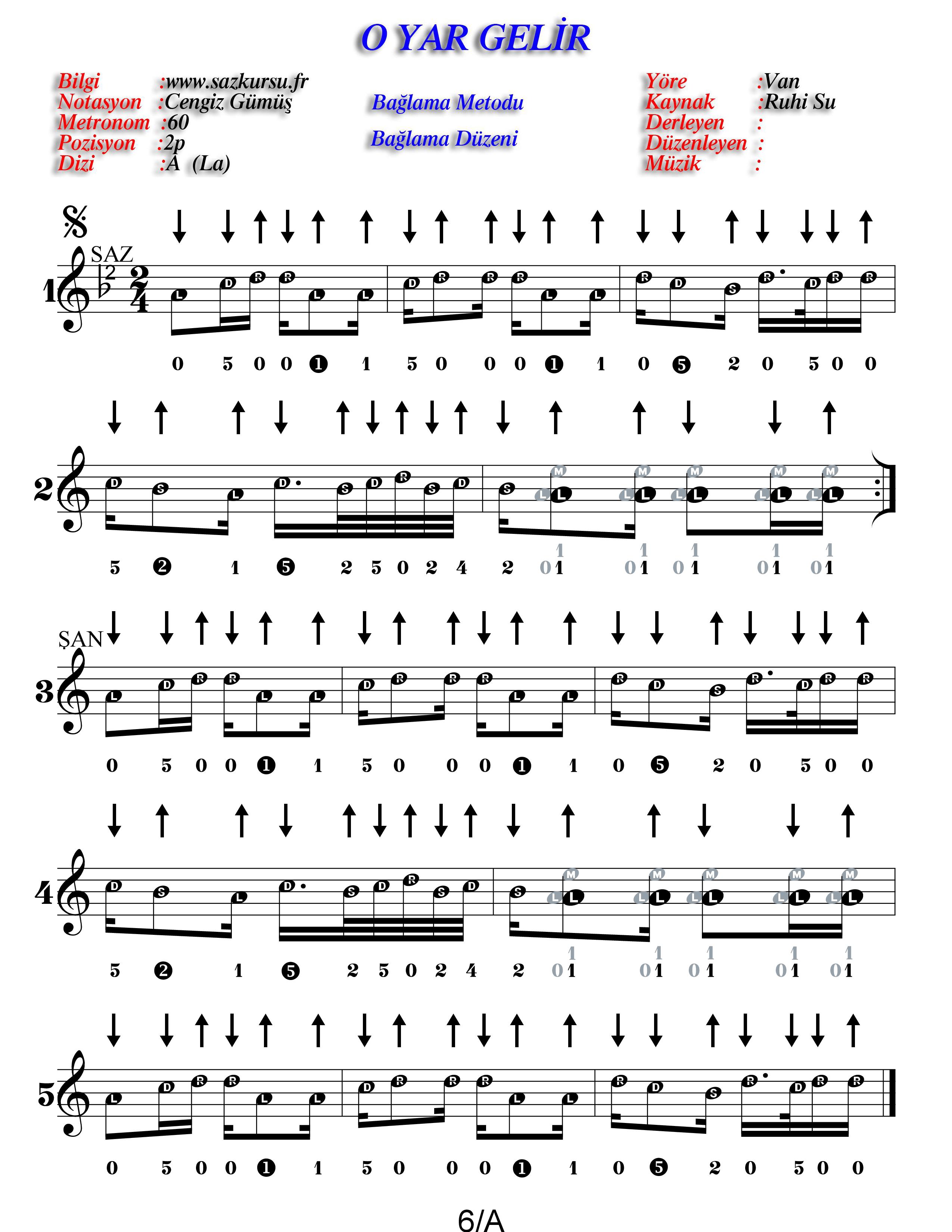 O Yar Gelir Orta Düzey Renksiz Özel Türkü Notaları